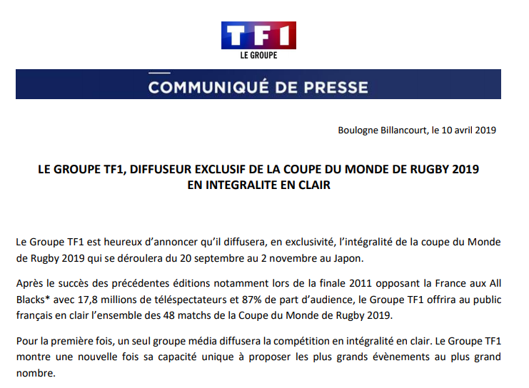 La compétition se tiendra du 20 septembre au 6 novembre prochain. Diffuseur exclusif de la coupe du monde de rugby qui se déroule au japon du 20 septembre au 2 novembre, la « une » s'attend à de bonnes pour tf1, son service des sports et plus globalement les finances du groupe, le mois de juin 2019 restera dans l'histoire comme une divine surprise.